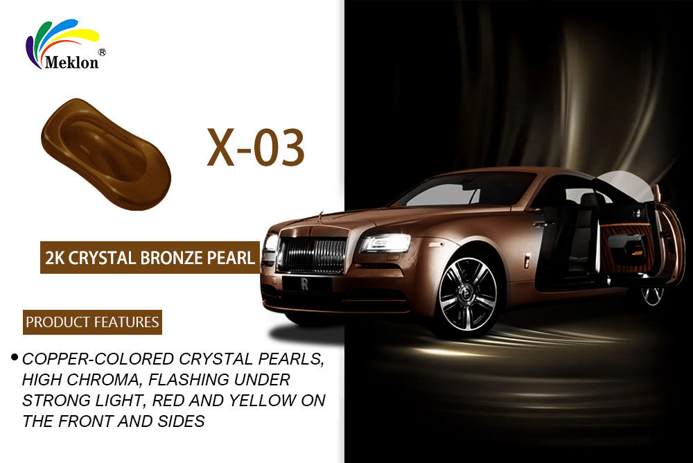 Meklon ProshicheP-X03 Crystal Bronze Pearl เป็นเม็ดสีคุณภาพสูงที่มีสีสันสดใส ประสิทธิภาพดีเยี่ยม พลังการปกปิดสูง และความมันวาวดี ซึ่งสามารถนำไปใช้อย่างแพร่หลายในสาขาต่างๆ เช่น รถยนต์ การก่อสร้าง เฟอร์นิเจอร์ และอื่นๆ